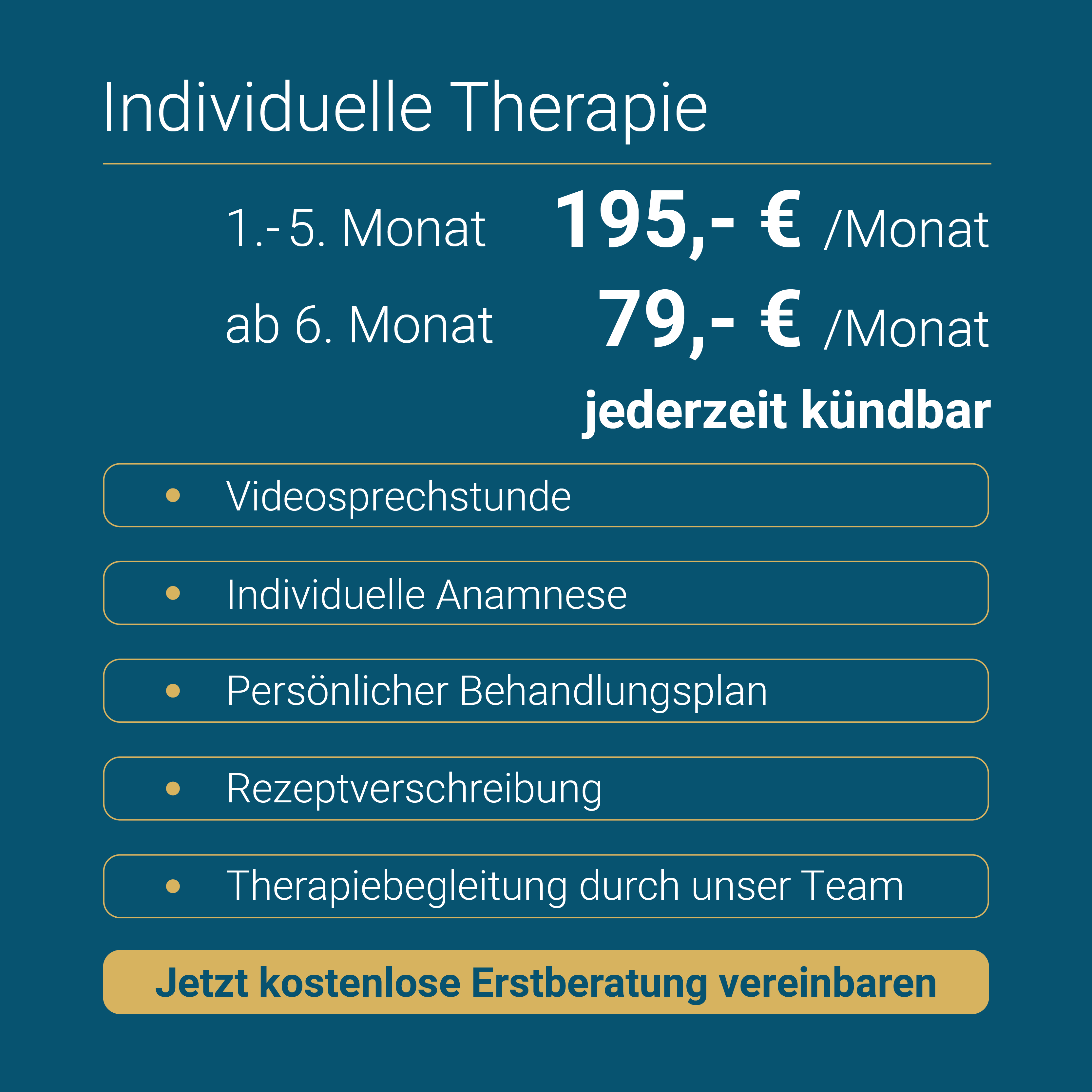 Zu Beginn Ihrer individuellen Therapie führen wir mit Ihnen ein ausführliches Erstgespräch inklusive Anamnese. Auf dieser Basis erstellen wir Ihnen einen individuellen Therapieplan, verschreiben Ihnen das empfohlene Medikament und begleiten Sie während der Therapie.